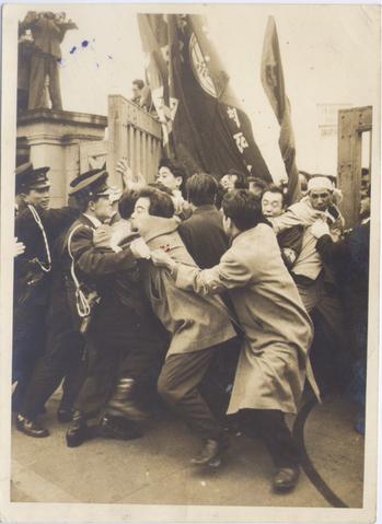 Armed Tokyo Policemen Vainly Trying to Drive Away Angry Japanese University Students as They Sinash Open The Main Gate And Swarm Into The Compound of The Diet Building in Tokyo