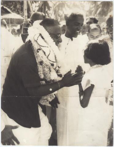 The Premier,Sir John kotelawala,being Garlanded by a Student of the Roman Catholic School,Kuliyapitiya