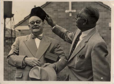 Sir John Kotelawala Seems to say,Presenting his Host Sir Edward Hallstrom,President of Sydney's taronga Park Zoo a Hat from Ceylon