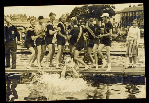 D.C Schall Cox of the Princetown University Eight is Thrown into the Water by His Crew Mates