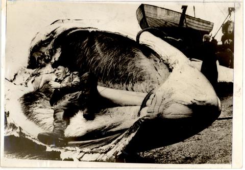 Alexi Glageley, a Cutter on board the Russian Whaler "Aleut" seems to find the jaw of a finback whale a good-place as any for a rest, after a whalong expedition in the Southern Antarctic