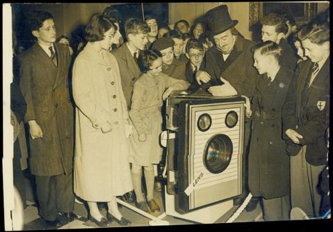 Dr. Harry Baines illustrating his Lecture on “How Photography Began” by Using a Huge Model of an Ordinary Box Camera