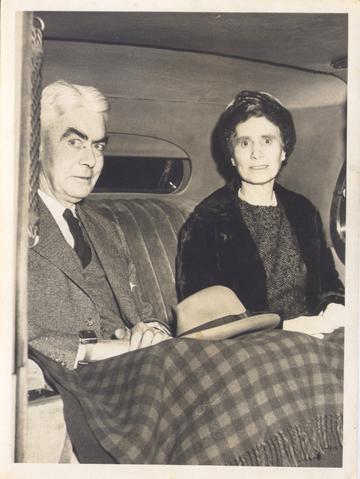 Lord Dunrossil Pictured with Lady Dunrossil in Their Car when They Left Their London Home in Temple Gardens This Morning En Route for the London Docks Where They are to Board the "Ceramic" Which Will Take Them ti New Zealand,From They Will Fly to Canberra by R.A.A.F. Plane in Order That LOrd Dunrossil Can Take Up His New Post As Governer-General of Australia.