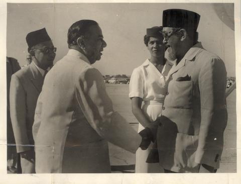 Prime Minister Suhrawardy of Pakistan Greeting Indonesian Prime Minister , Mr. Ali Sastroamidjoj on His Arrival At Karachi Airport