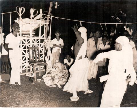 At the Stat of the Gammaduwa Two Kapuralas Dance Before a Mal Yahana Dedicated to the Goddess Pattini