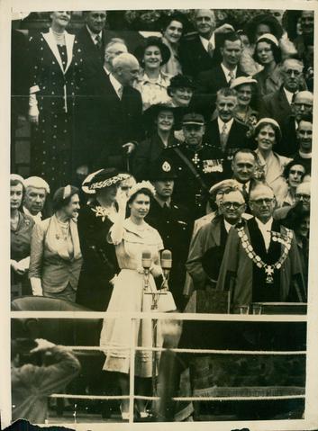 The Queen waves to the Cheering Crowd from a Dias erected outside the Town Hall in Auckland New Zealand