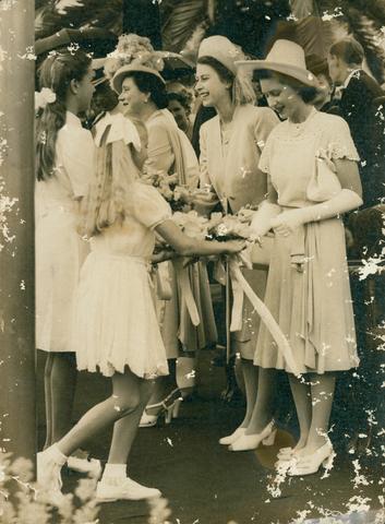 Princess Elizabeth Receiving her Bouquet from Katusha Smuts amd Princess Margaret Receiving her Bouquat from Helen Botha