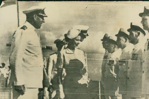 The Queen with the Duke of Edinburgh talking with the Ship's Officers aboard the "Black Prince"