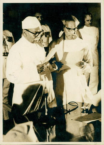 Dr. Rajendrea Prasad, the Indian President Administering the Oath of Office to Mr. V. K. Krishna Menon, after his Appoinment as India's Defnce Minister.