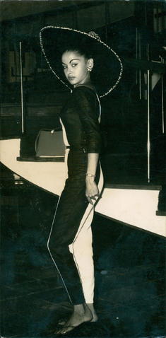 Right is Elizabeth Again in a Skin-Tight Matador Pants and Top in Black with a White Panel down the Center.