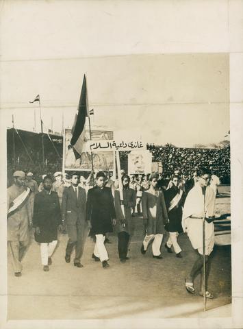 The Indian delegation to the First Afro Asian Yoth Conferance Held in Cairo BeingLed By a Yoth Dressed Like Gandhi.