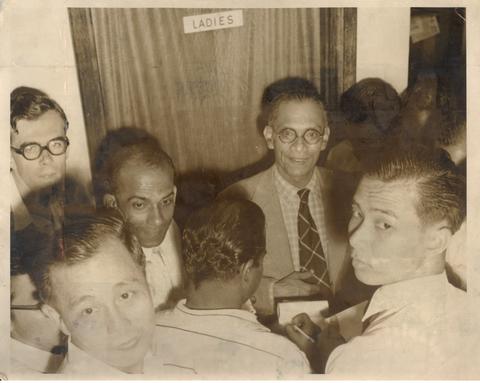 Mr.Bandaranaike,surrounded by reporters,giving a statement to the Press at the Kuala Lumpur airport terminal
