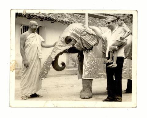 Baby elephant "Saliya" of Mahiyangana Raja Maha Viharaya in his new caparison which was donated by Mr. K. C. Thadani (right). Sri Chandananda Mahanayake Thero of Asgiriya Chapter is also present. (Picture by K. Bandaranayake, Kandy)
