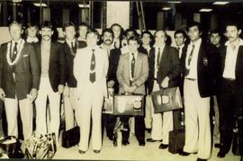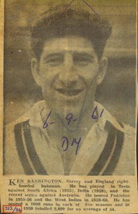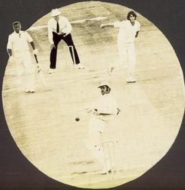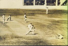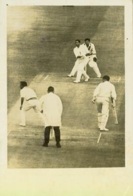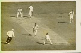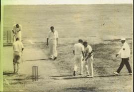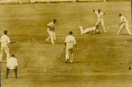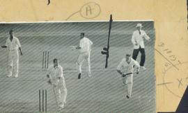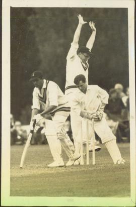 C.G.BORDE is clean bowled by R.W.Elviss for 46 and slip fielder F.S.Goldstein jumps in delight