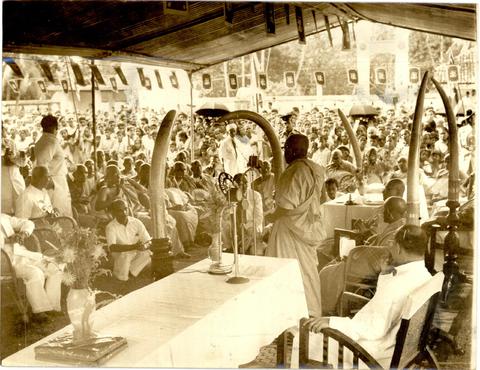 Rev. Galapatha Khemananda thero is reading the scroll presented to Rev. Hedigalle Pannatissa thero upon his appointment as the Chief Sanghanayaka of India. William Gopallawa, the Governor of Sri Lanka, and the newly appointed Chief Sanghanayaka thero are seated.