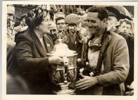 Jack Brabham hand Over the Wheel to His Baby Son