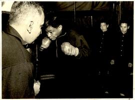 T.Aung,South East Asian Champion in the Lightweight Class, is given a helful Hand from a Japanese Student after a Work out at Chuo University Gymnasium in Tokyo