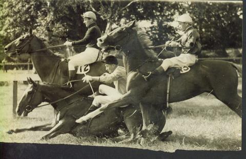 "Inquisitive Pete" Comes Down Between Two Runners at Pegasus Steeplechase