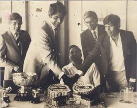 Vijay Amritraj The Indian Davis Cup Captain And Senaratne Non Playing Captain And Coach of Sri Lanka Cutting a Cake Before The Davis Cup Draw at The Supper Club Hotel Lanka Oberoi
