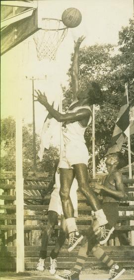 Kithsiri, of the Army Gets in a Basket While Three of the Police Players Look on Anxiously