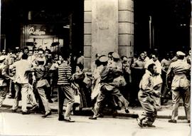 An Injured Student Leans on a Police man and another Student Holds up a Second Injured Student