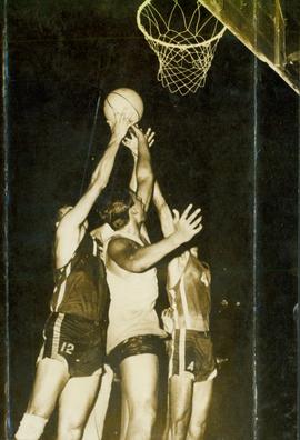 Gamini Silva Wedged in Between Two Army Players as They all Go Up For a Rebound