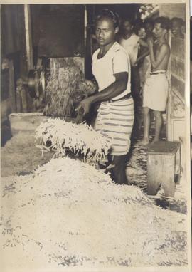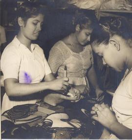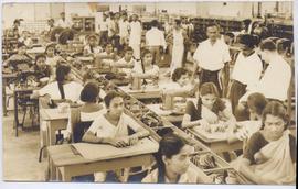 Some girls iron the cut pieces while other sew them