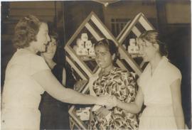 Winning Smiles as Mrs. F.V. Street , Wife the Trade Commissioner for Australia in Ceylon , Congratulated Miss D.R.N. Chandra Sekera , Winner of the First Prize in the Pond’s Dream Flower Contest , at the Prize Giving Held at the Hotel