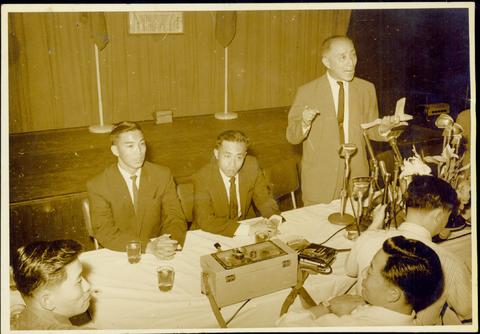 Picture taken during a press conference held in Taipei shows Mr. Feng Chi., Secretary-General of the Mainland China Rehabilitation Committee, introducing Chiang Kwei-ling (right), a radio operator of the Chinese Communist Embassy of Cairo, and Soong Dai-lou, an army officer stationed in Burma, after they had made their way to Taiwan.