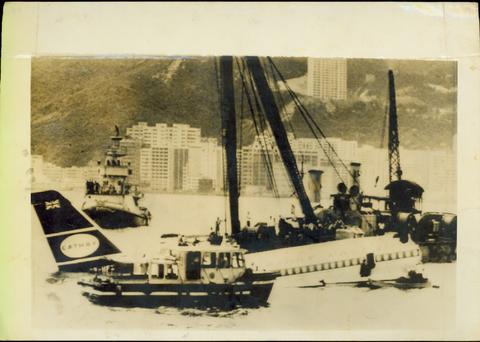 Rescue boats and a floating crane working around a Pacific airways Convair 880 which crashed recently in Hong Kong harbour, after taking off with 127 people aboard. All but one of them survived.