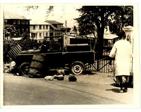This road block consisting of a damaged vehicle, empty oil drums, and huge stones, was erected by civilians in a Freetown street on March 21st, as Army Chief, brig, David Lansana, declared martial law after pacing the newly designated Premier Siaka Stevens under house arrest. This followed the general election in the tiny West African nation.