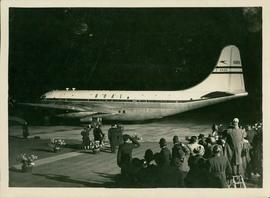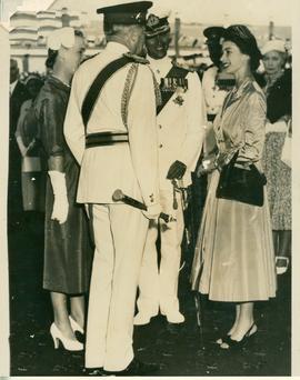 H.M.the Queen greeted by Sir Alexander Hood the Governor as she left the Aircraft at Kindley Field,Bermuda