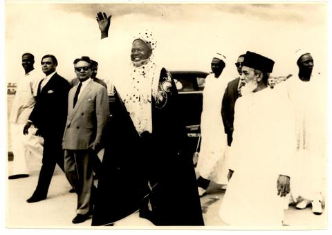 The Prime Minister of Northern Nigeria, Sir Ahmadu Bello waves to the crowd who had gathered at the airport to welcome him as he arrived at the Karachi airport on June 24 for a visit.