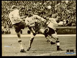 McNeil, England’s Left Back, and Springett, the Goalkeeper are both Beaten as a Shot From Suarez Gives Snaia a Givend Goal