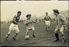 Spirited Play by the “Popsies” During a One man Attack on Their Goal. The Sturdy Right-Back Favor a Cap with her Long Shirt