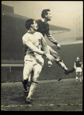 Ken Brown, West Ham Left-Half, and Derek Dougan, villa Centre-Forward, in a Heading Duel in Front of the Goal During the West Ham-Aston Villa Game Played Recently at Upton Park