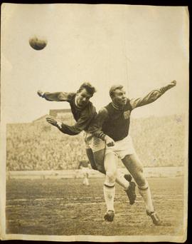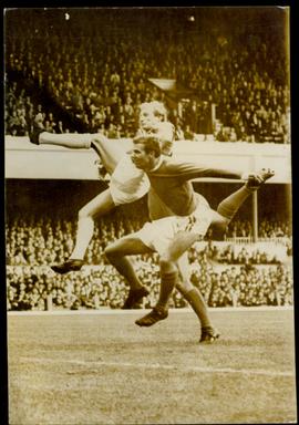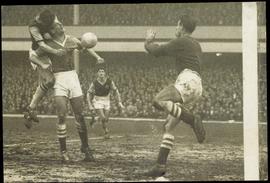 Dennis Lew, the United inside Left, Leaps in the Air Above Court the Arsenal Left-Half an Another Araenaldefender, to Head for Goal