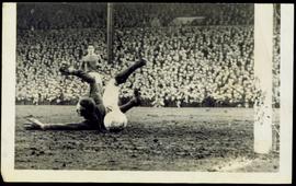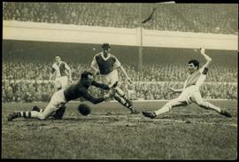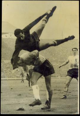 Suarez, the Spanish Outside- Left in a Remarkable Collision with Springett the England Goalkeeper Durimg Play in the England-Spain Soccer International at the Wembley Stadium