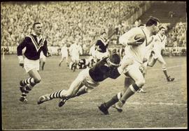 On the Snow Covered Twickenham Ground, two South Africa Under Grads, B.J Van Vuuren and S.W. Van de Corf, Make Sure of Stopping London’s J.E. Williams in the Match Between S.A. UNIVERSITIES AND A London XV, Which Ended in a 6-6 Draw