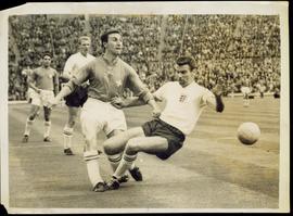 N.Eschmann, the Swiss Centre-Forward, has a Shot a Blocked by Peter Swan the England Centre-Half, During the Match at Wembley