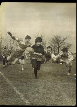 A Flying Tackle by two Members of the Male Team Fail to Stop 17-Year-Old Linda Godfrey, of Iiford, Essex who Scored a Try for The Girl’s team