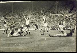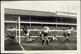Spurs Centre Forward Les Allen Leaps to Score his Team’s Third Goal