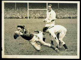 j.Spencer Passing the Ball out of a Serum, and Alan Pak the Welsh Captain Dives Over the Line in a Spectacular Fashion to Score the Welsh Try