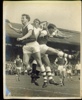 Shaffield Wednesday Goalkeeper, Springett Makes a Daring Save From the Feet of Orient Left Half Cyril Lea. Sheffield Right-Half Eustace Watches