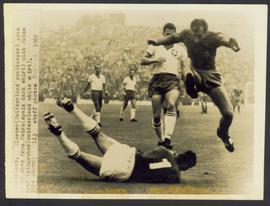 Alfanso Diaz Portugal of the Choeago Laves the Ground After Giving the Ball a Hard Kick Back wards in mid April 1967